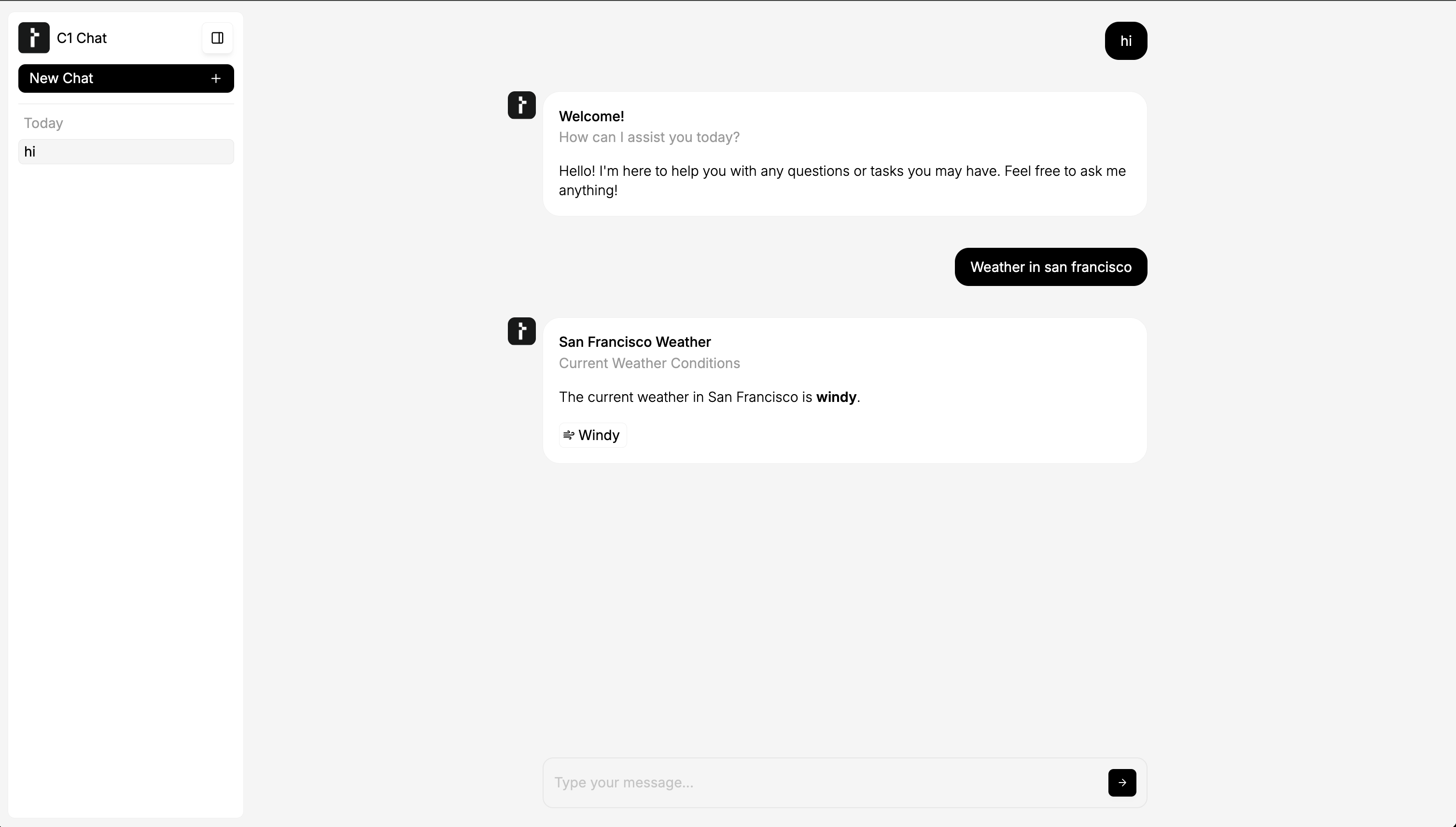 This guide demonstrates how to set up a simple conversational agent using LangGraph in Python, connected to the Thesys C1 API endpoint. We’ll build a basic graph that manages message history, a dummy weather tool and streams responses back. All the messages are stored in-memory using Langgraph MemorySaver The complete code for this guide can be found in the Thesys examples repository.Backend Setup