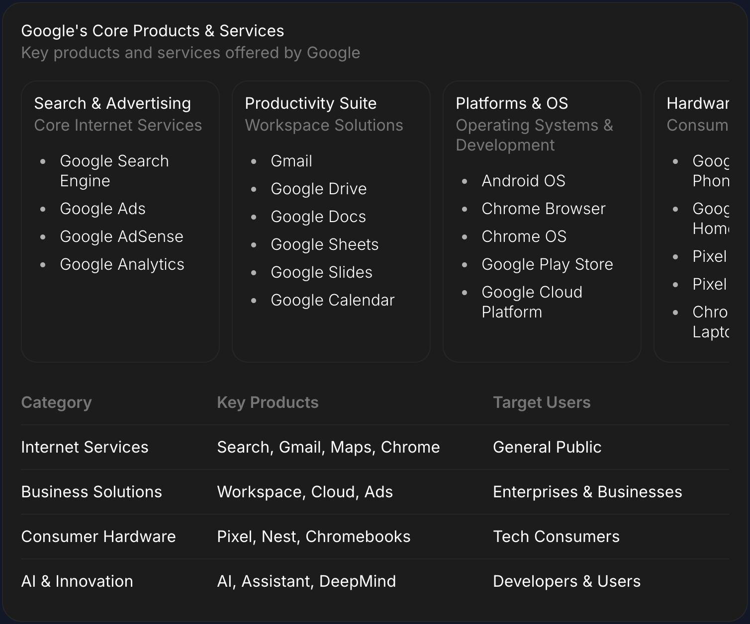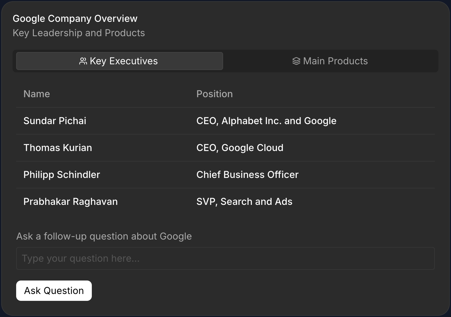 Use tables to show structured data, such as financial highlights or key executives. | ![]() |